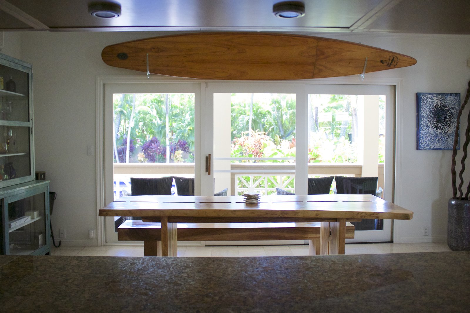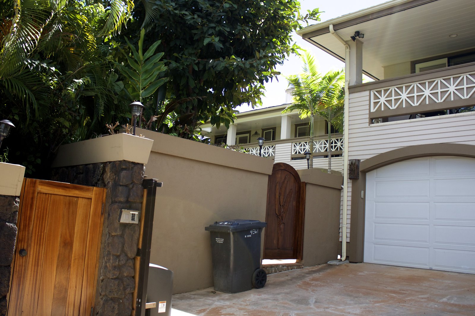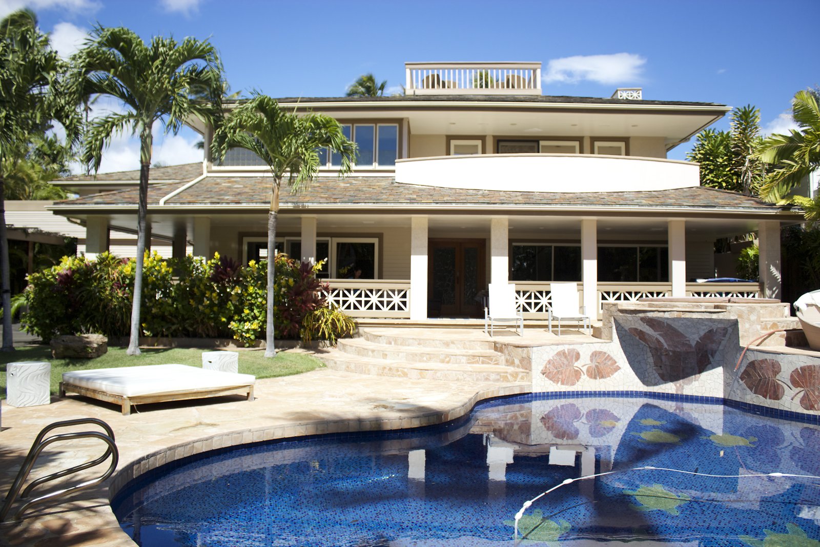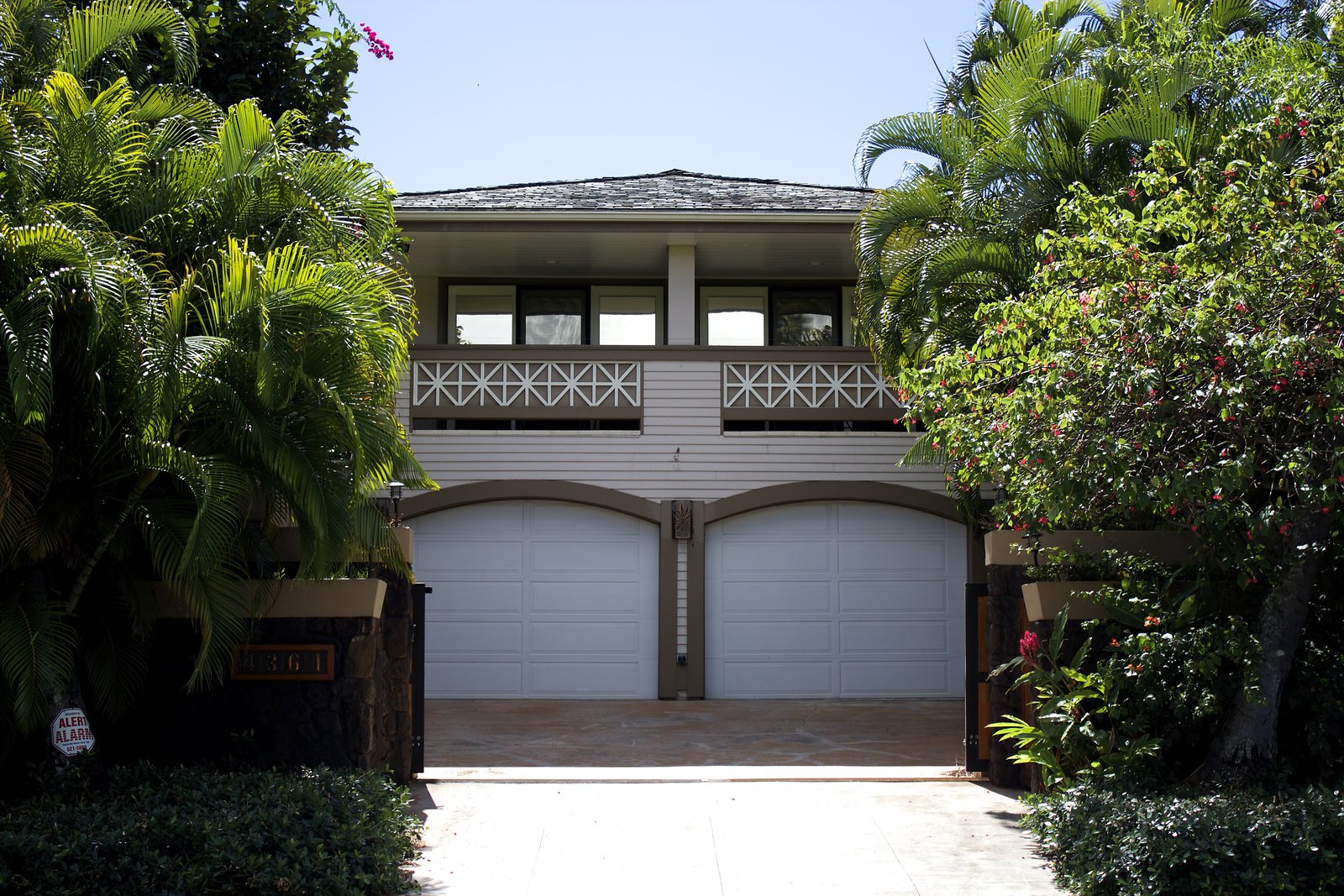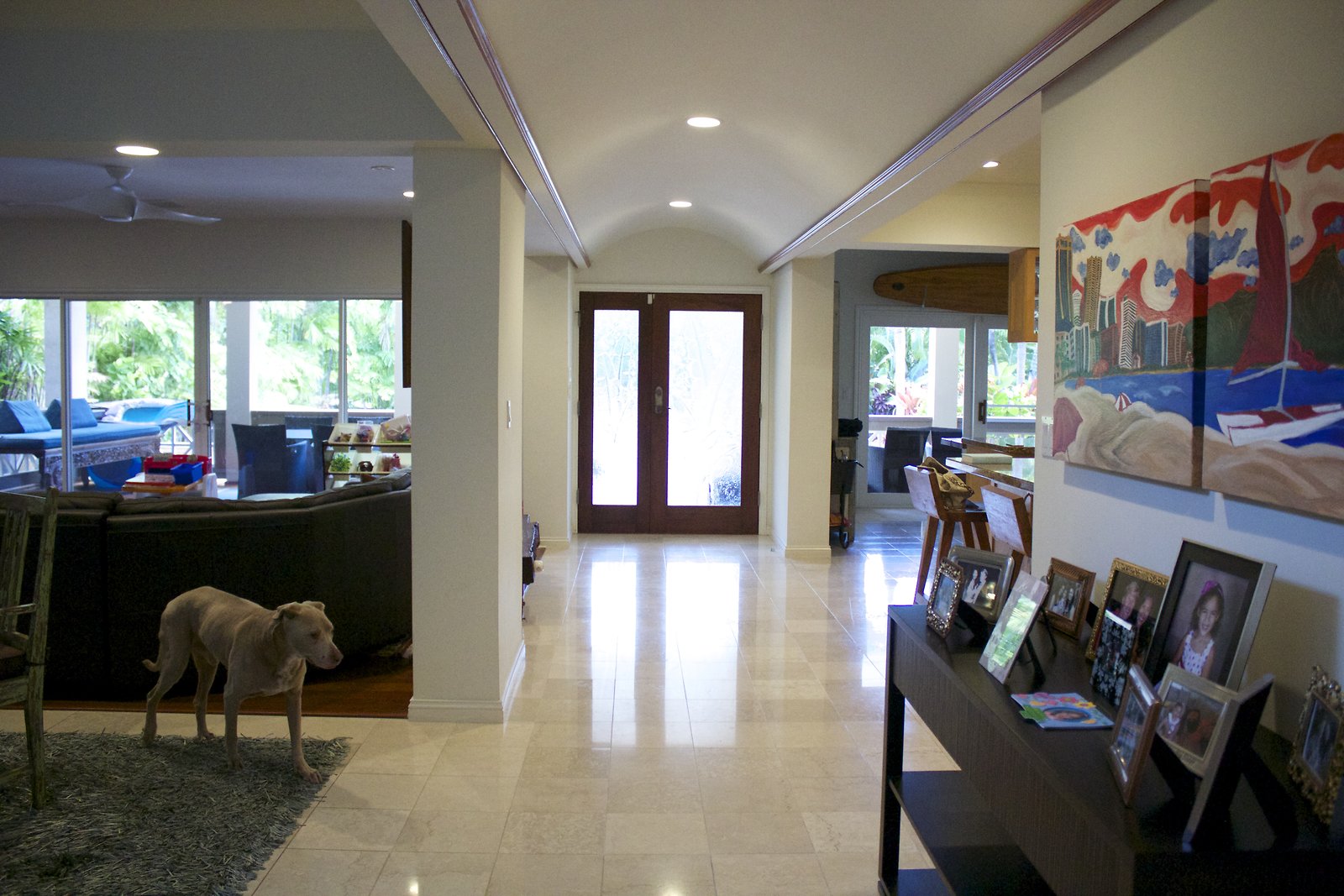 a large home in Kahala with entrances on both Kahala Ave. and Royal Place. Lots of artwork by the husband, and vintage paddleboards and surfboards in all areas of the house. Pool near the Royal Place entrance.