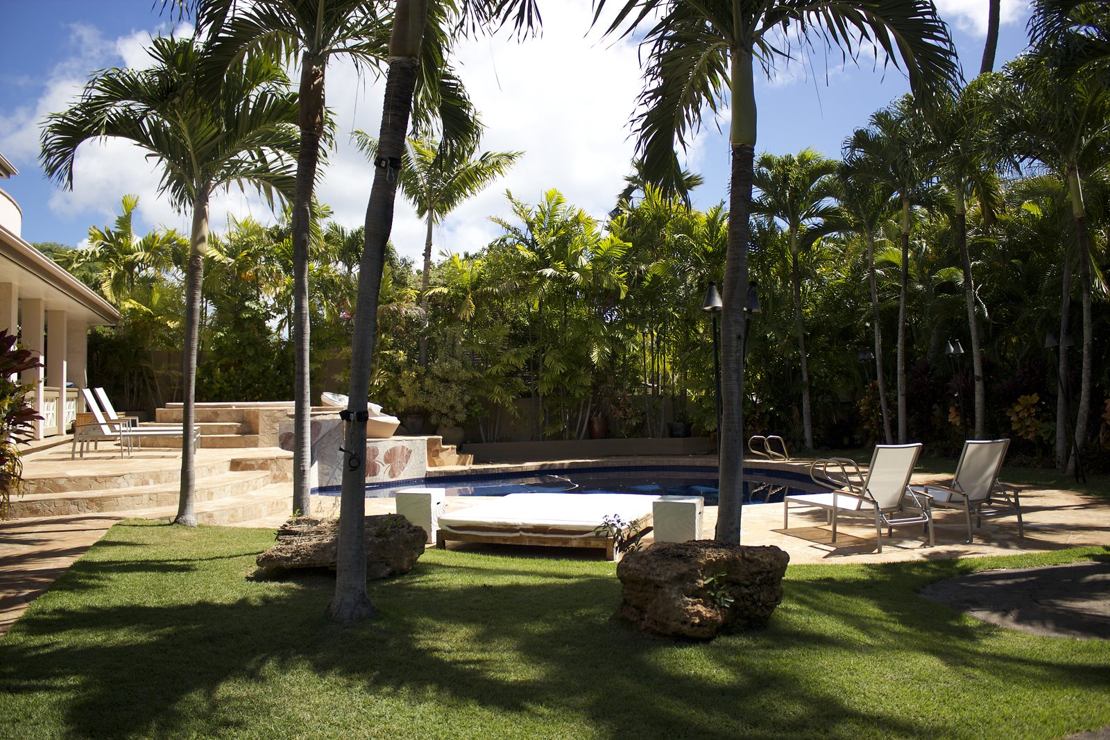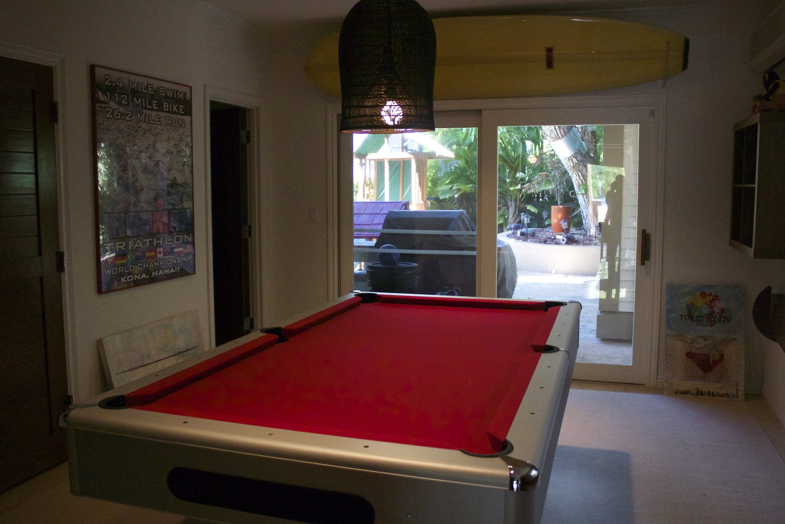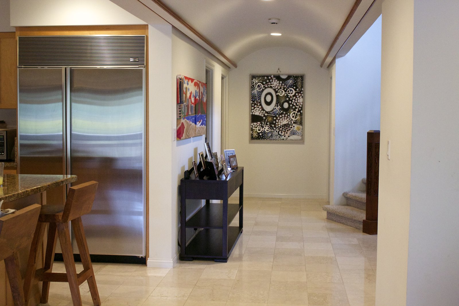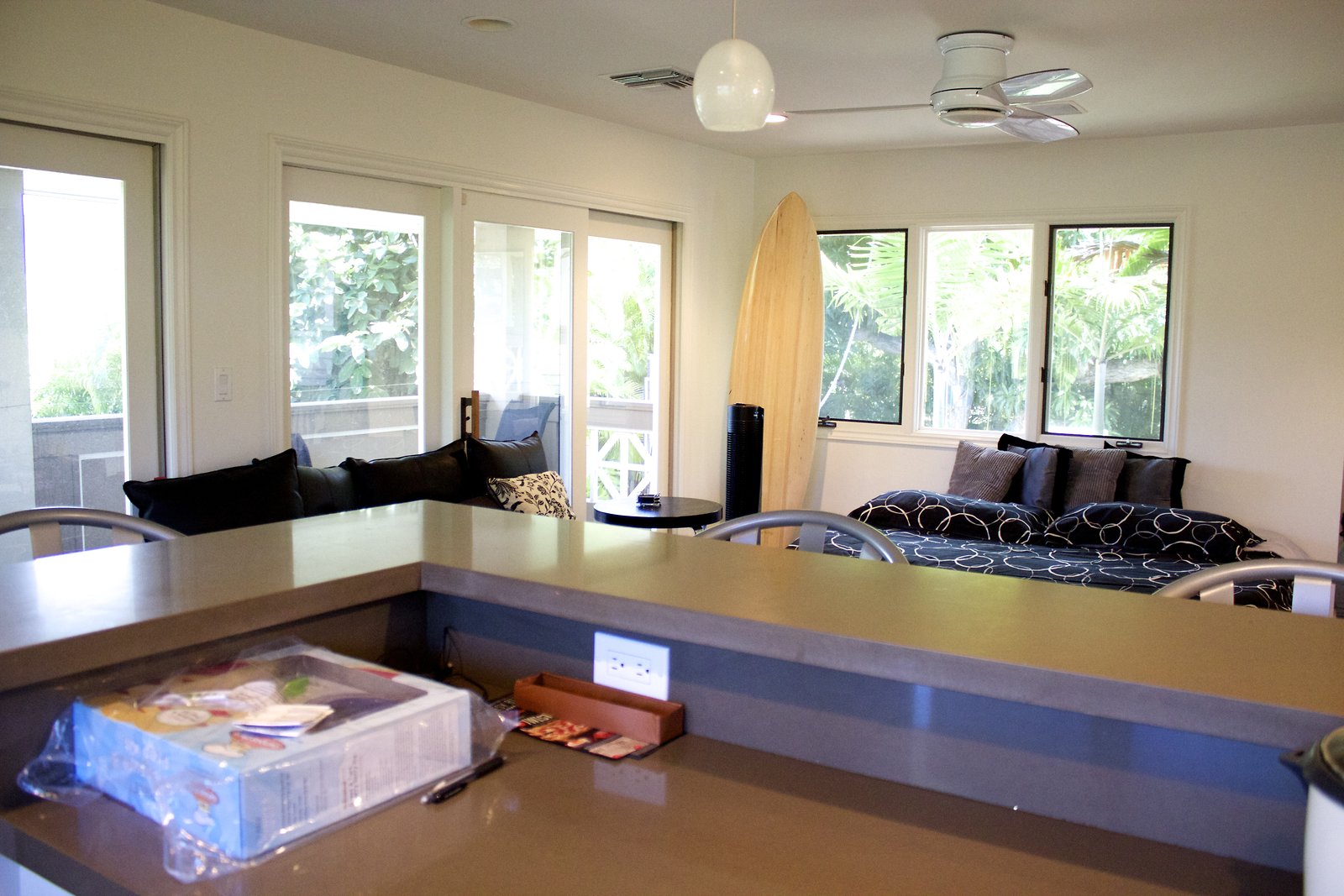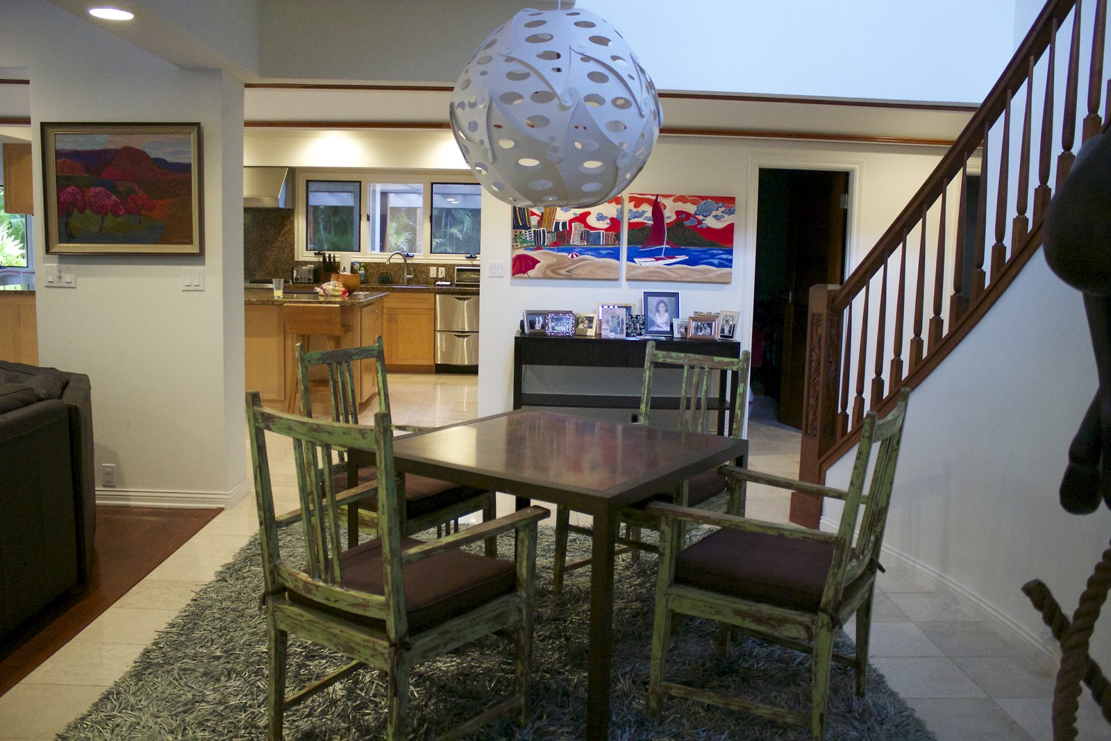 a large home in Kahala with entrances on both Kahala Ave. and Royal Place. Lots of artwork by the husband, and vintage paddleboards and surfboards in all areas of the house. Pool near the Royal Place entrance.