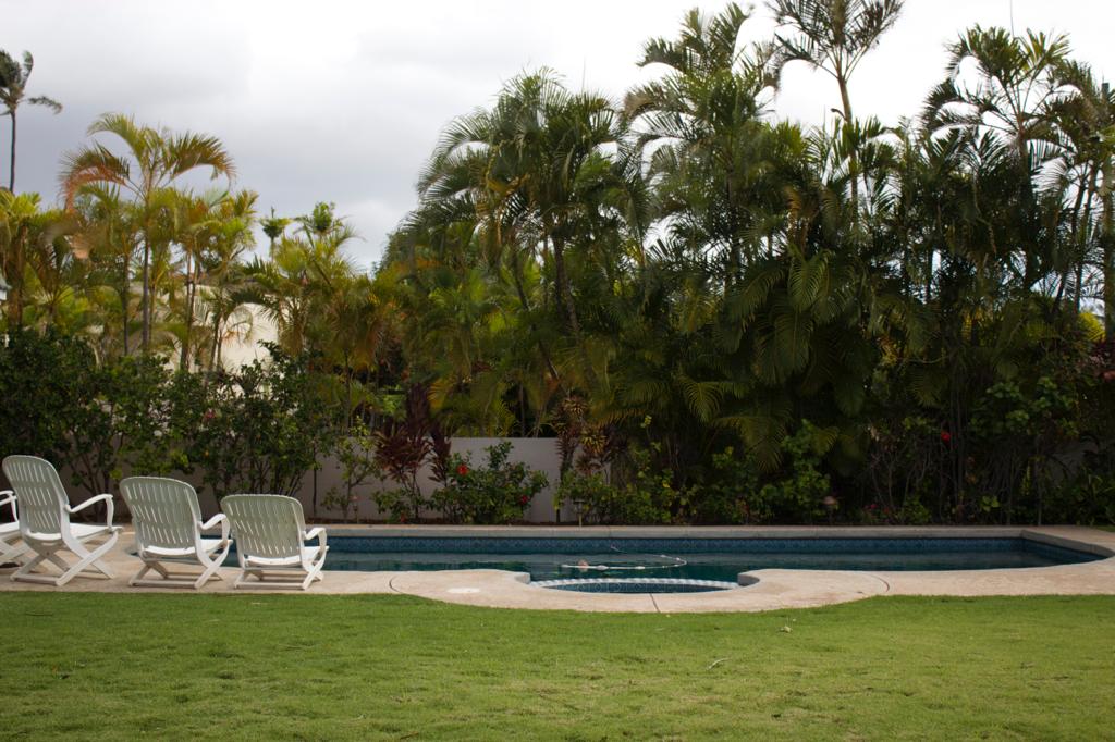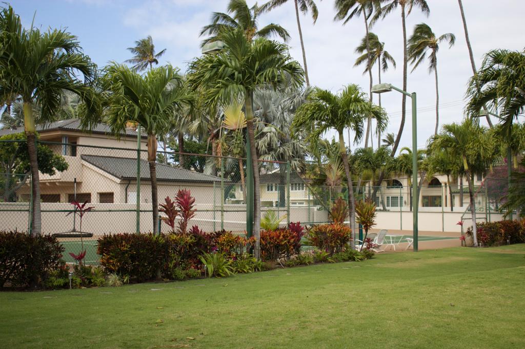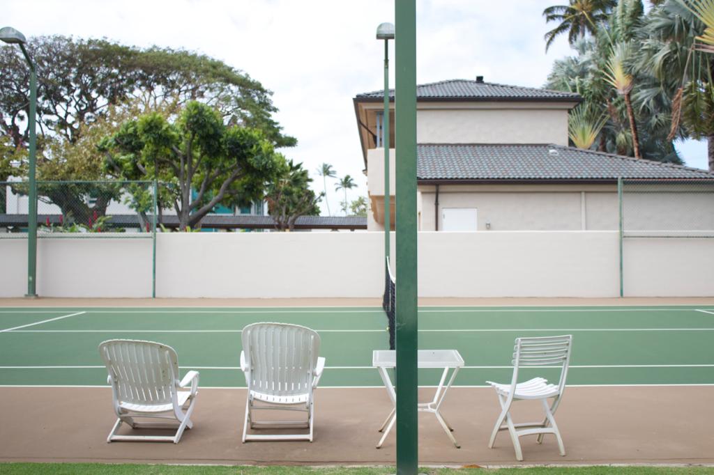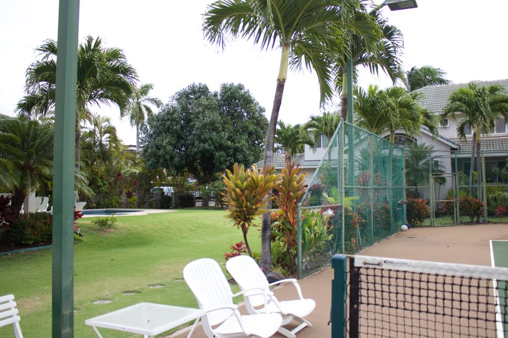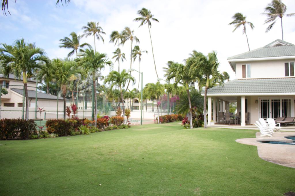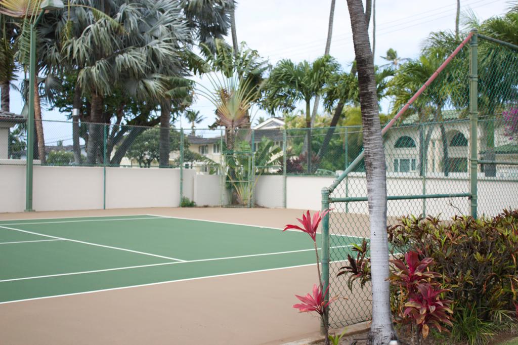 There is a tennis court and a pool between the two houses.