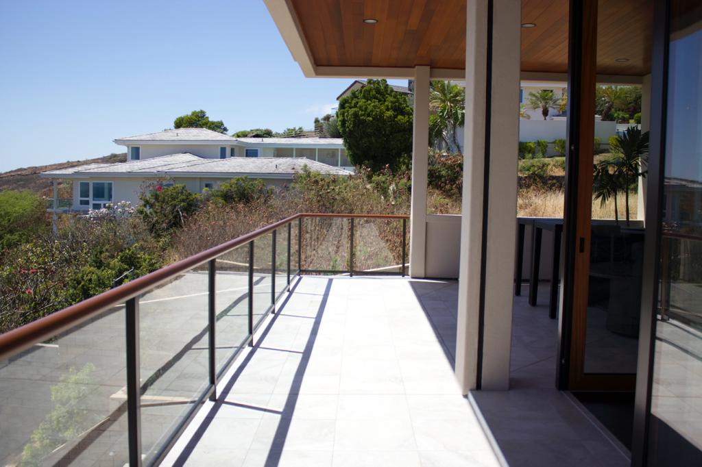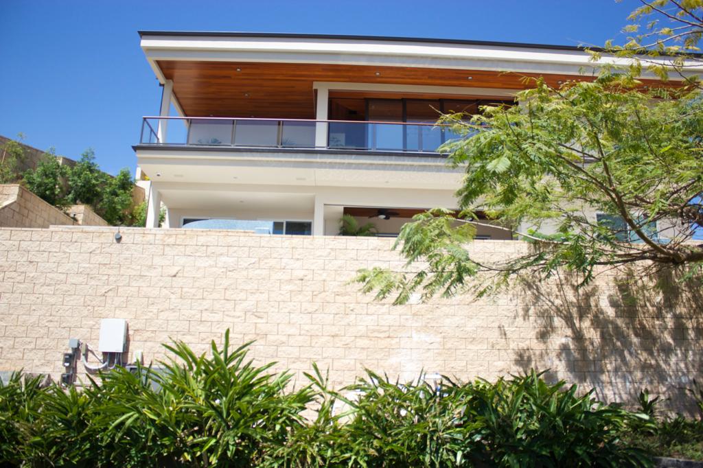 Has an infinity pool and a lower lawn area, as it is situated on the side of the mountain, and the property extends downward.